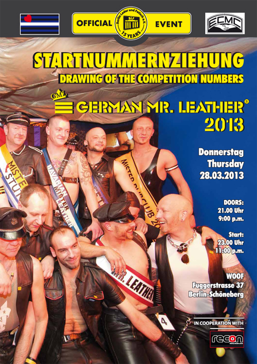 Hier haben alle ab 21.00 Uhr die Gelegenheit einen ersten Blick auf die Kandidaten der GERMAN MR. LEATHER 2013 Wahl zu werfen.