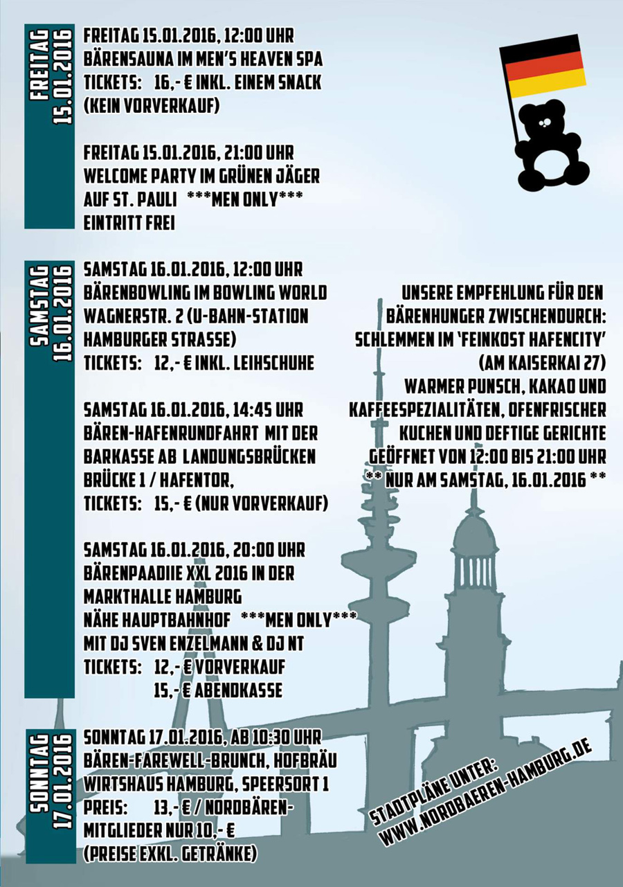 - Samstag 16.01.2016, 20:00 Uhr Bärenpaadiie XXL in der Markthalle Hamburg, Nähe Hauptbahnhof, Eintritt 12€ VVK, 15€ AK ***** MEN ONLY ! *****