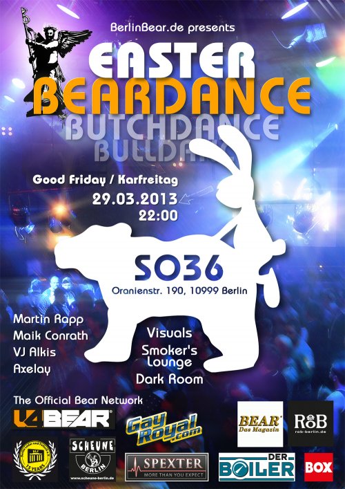 Haarig, kerlig, bärig? Die nächste EasterBearDance steht in den Startlöchern. Noch größer, noch aufregender. Am Karfreitag, den 29.März ist das SO36 wieder Schauplatz des Events, welches neue Maßstäbe in Berlin gesetzt hat.