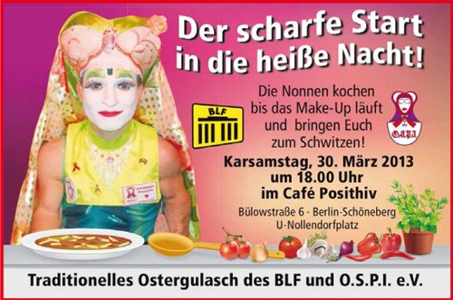 "Der scharfe Start in die heiße Nacht" – Feiert gemeinsam mit den Mitgliedern des BLF | Berlin Leder und Fetisch e.V. und den Schwestern des Ordens der perpetuellen Indulgenz beim Ostergulaschs die erfolgreiche Zusammenarbeit zwischen