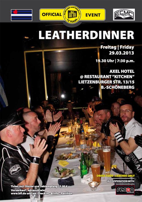 "Stilvoll Tafeln im Lederoutfit - Bei einem festlichen Dinner im stilvollen Rahmen werden sich die GML 2013 Kandidaten und die Jury präsentieren. Im exklusiven Ambiente des AXEL Hotels in Schöneberg habt Ihr die Gelegenheit, die Kandidaten persönlich kennen zu lernen und gemeinsam mit Freunden zu Abend zu essen.