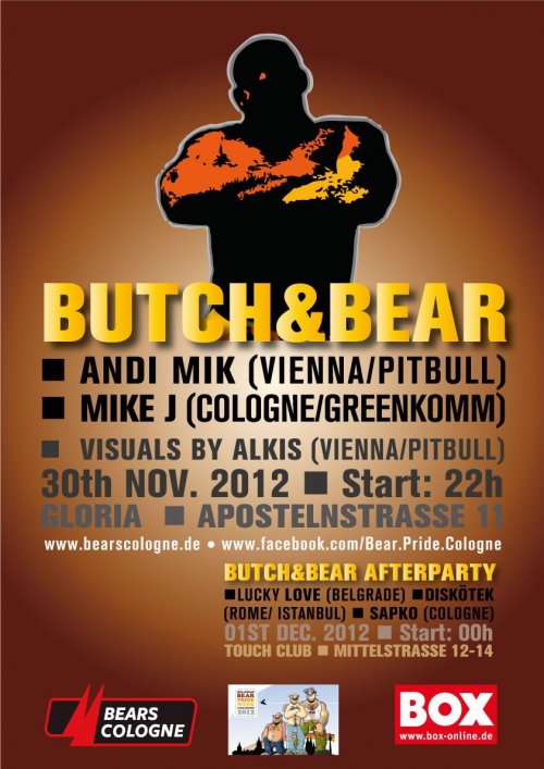 Die große Tanzparty im Rahmen des BEAR PARTY Circuit während der Intl. BEAR PRIDE Week Cologne mit den Top DJs Mike J (GreenKomm, NaughtyControl) and DJ Andi Mik (Resident Pitbull Vienna) und VJ Alkis (Pitbull Vienna).